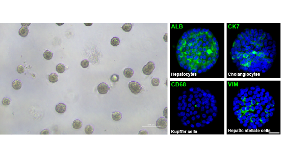 Day-25 iLivers represent uniformly sized 3D spheroids, which consists of hepatocytes (ALB+), cholangiocytes (CK7+), Kupffer cells (CD68+) and hepatic stellate cells (VIM+), as identified by immunofluorescence. Scale bar = 50 μm.