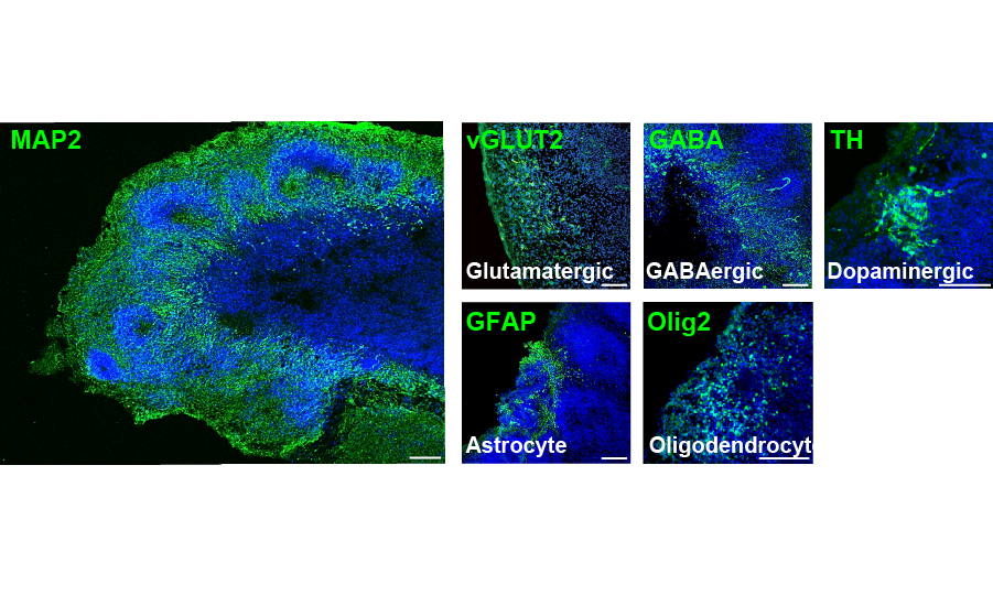 Immunofluorescence of day-90 iBrains identified many physiologically relevant neural cell types, including glutaminergic (vGLUT2+), dopaminergic (TH+) and GABAergic neurons (GABA+), as well as astrocytes (GFAP+) and oligodendrocytes (Olig2+).Scale bar = 100 μm.